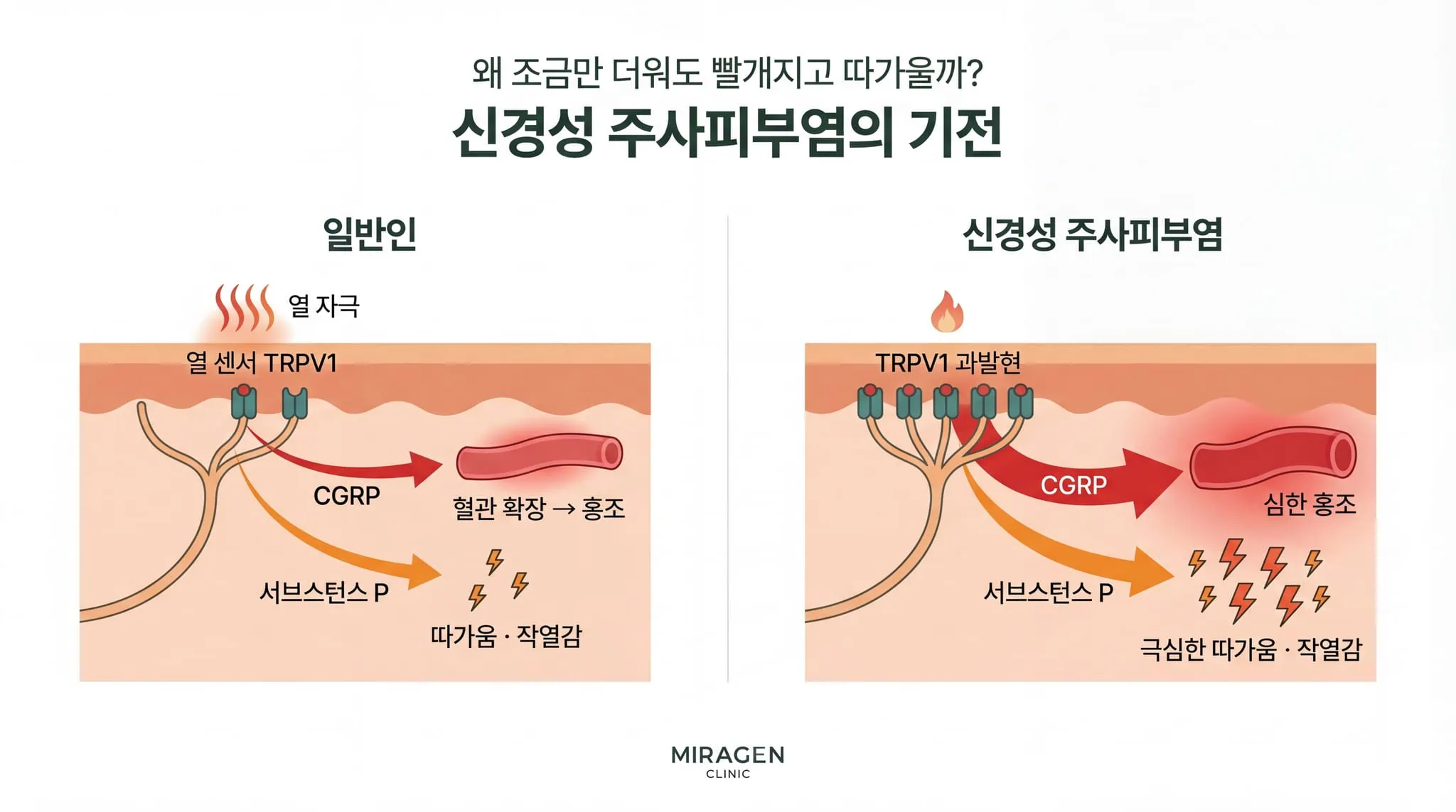 이 열 센서가 작동하면 신경에서 CGRP와 서브스턴스 P라는 물질이 방출됩니다.3 CGRP는 혈관을 확장시켜 홍조를, 서브스턴스 P는 따가움과 작열감을 만듭니다. 이것이 신경성 주사피부염입니다.